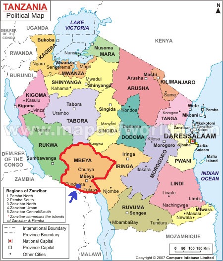 (タンザニア地図:赤で囲ってあるのがムベヤ州、青い丸がIlejeの位置)