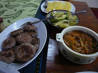 肉屋で肉の塊1KGを買って、お隣さん家にあるミンチ挽きを貸してもらって作った。