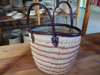 牛皮で持ち手をつけたこちらのバスケット、日本でも販売できそう。