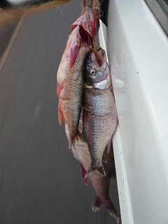 お土産の魚をゲットし、車のサイドミラーにくくり付けて帰るワイルドさ。